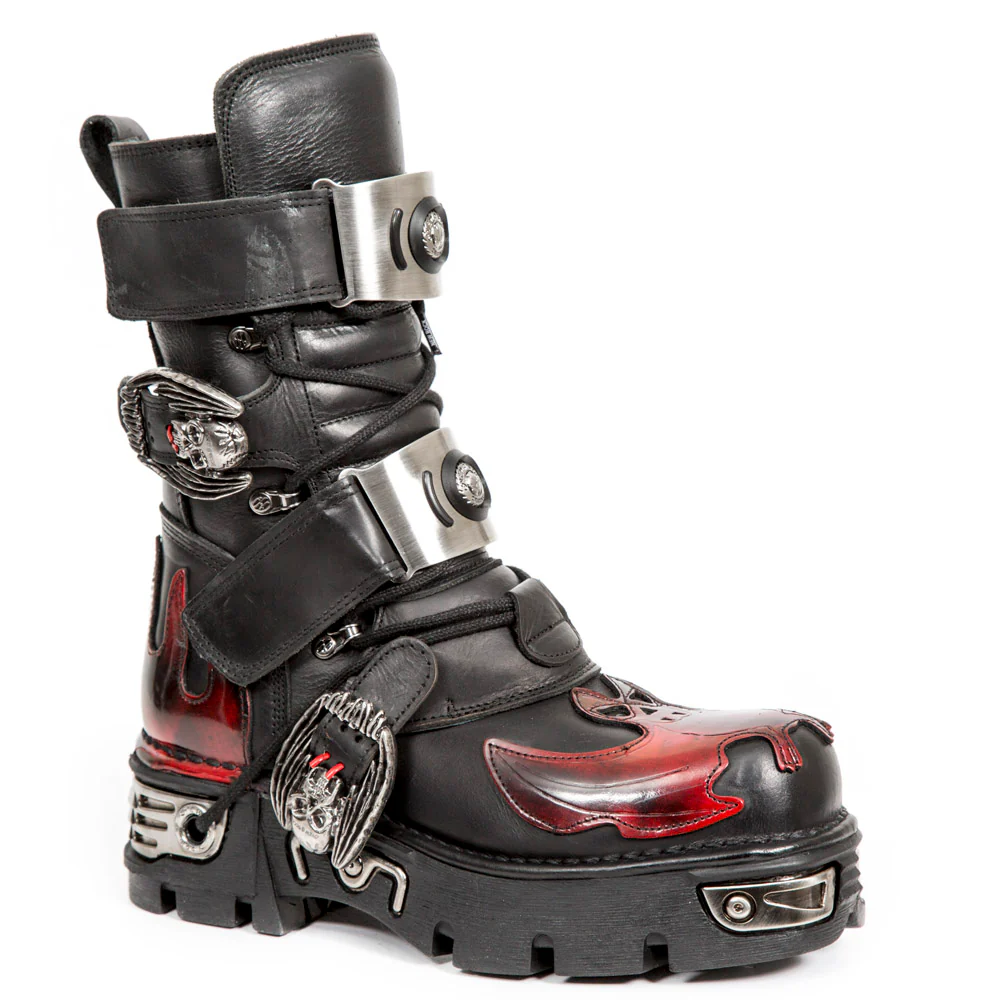 High boot from the METALLIC collection, crafted in genuine leather. Features a gothic and metallic design with bold flame details and bat-themed buckles. Equipped with lace-up, buckle, and velcro fastenings for a secure fit. boot-metallic-m-195-s1)