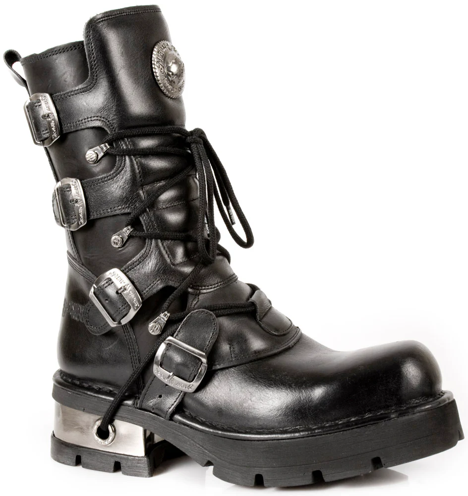 Command attention with the M-373-S1. A standout from the METALLIC collection, this boot features distinctive buckles and metal plates on the platform, embodying New Rock's characteristic rocker personality.
